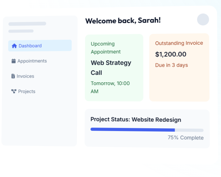 Give your clients a professional, dedicated space to manage appointments, view projects, pay invoices, and access exclusive content. All under your own domain.